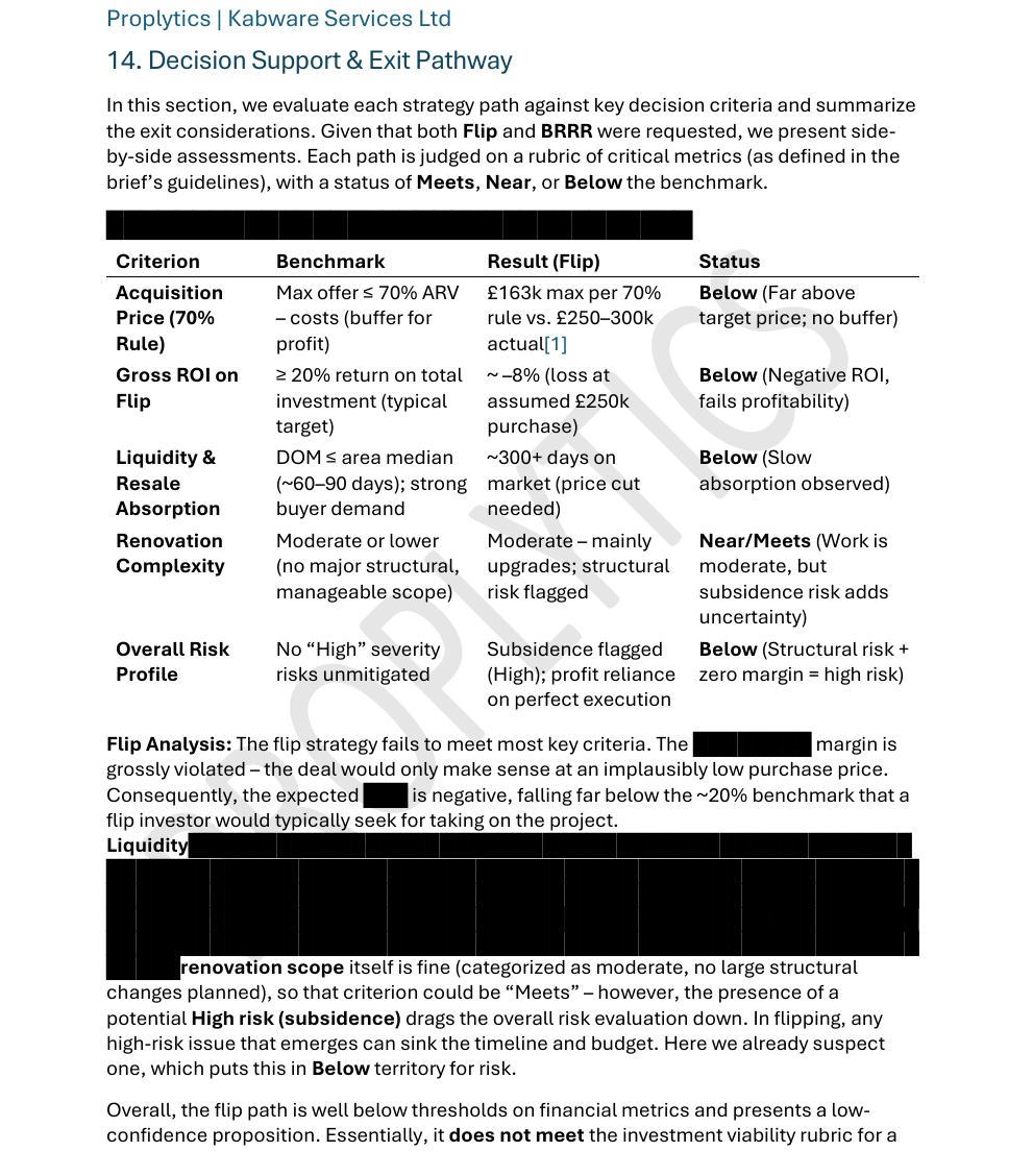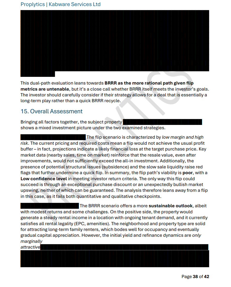 Every report includes a full After Repair Value (ARV) estimate based on genuine comparable sales, a 70% rule analysis, ROI projections, local market trends, and risk flags covering flood zones, subsidence, conservation areas, and more. Reports also include comparable property data and an overall investment recommendation.